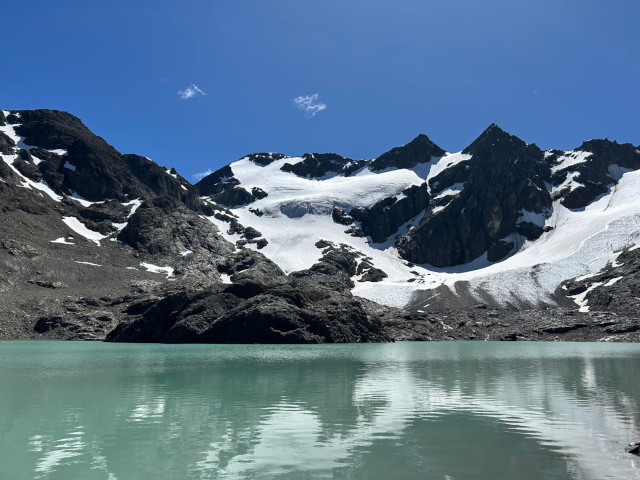 Jour 3 : toujours plus de vent et de pluie pour démarrer la journée, mais on continue d’apprécier la mer de glace en fond. On passe un col et on se retrouve un peu protégé du vent, avec du soleil, et surtout devant un magnifique et immense lac. Le spot de bivouac du soir est idyllique au bord du lac, avec le lac, des icebergs et en fond la barrière de glace du glacier qui arrive dans le lac. Malheureusement, énormément de vent qui finit heureusement par se calmer avec la nuit.