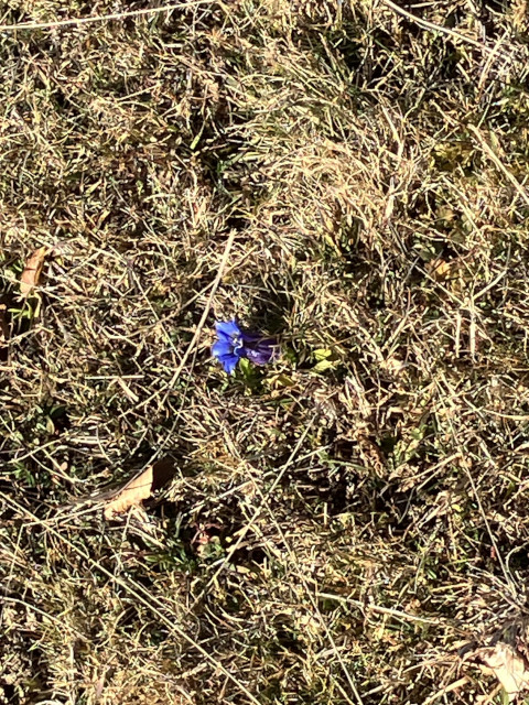 Nous poursuivons la montée dans l’herbe grillée par la neige mais où déjà, fleurissent des gentianes.
